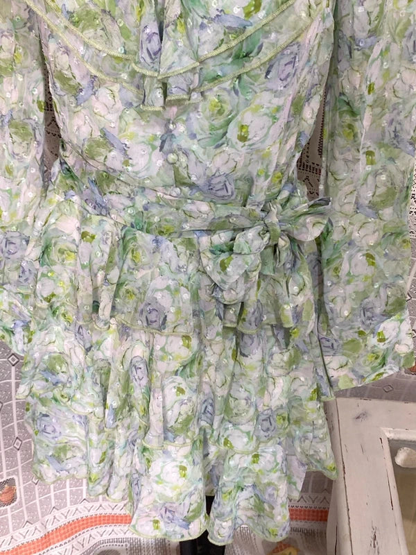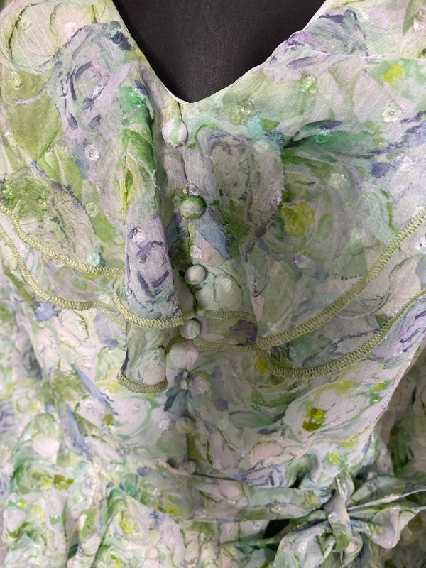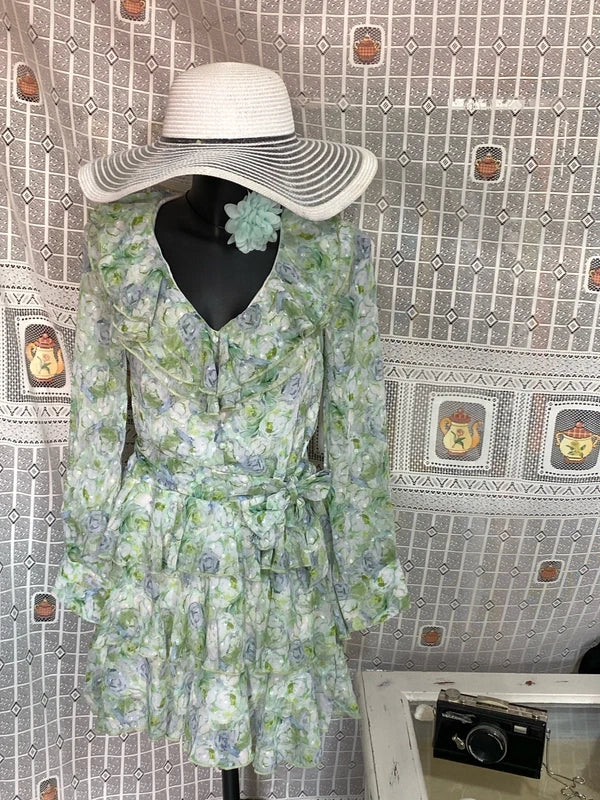 This elegant Shein long-sleeve dress in size XS is perfect for special events like weddings and ceremonies. Crafted from sheer fabric, it features delicate ruffles and flounces at the neckline and skirt, embellished with tone-on-tone buttons at the cuffs and chest. The sash belt gracefully accentuates the silhouette; for tips on how to tie the bow, please contact us. A refined and new piece, without a tag, for impeccable style on the most important occasions.
