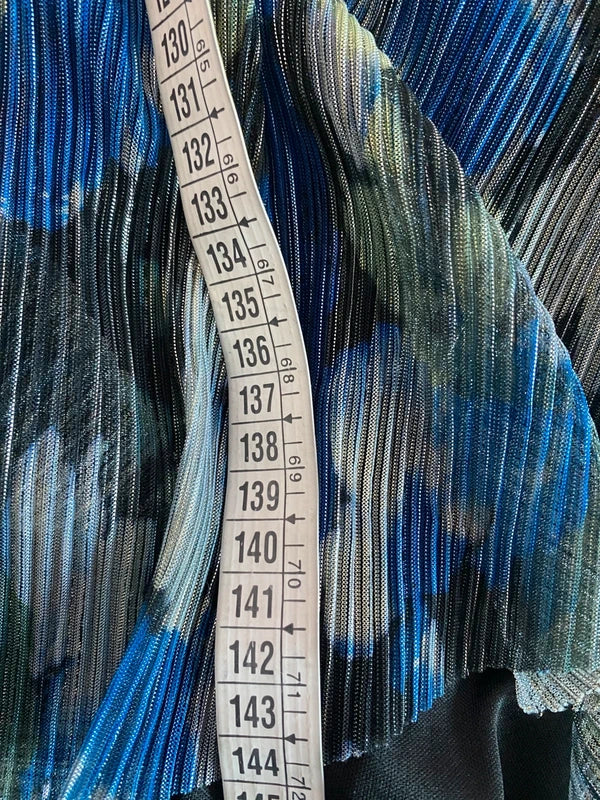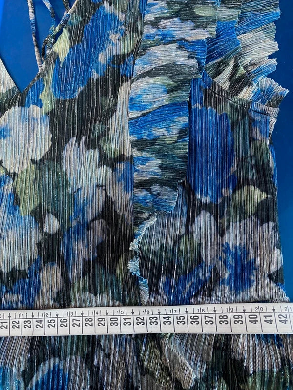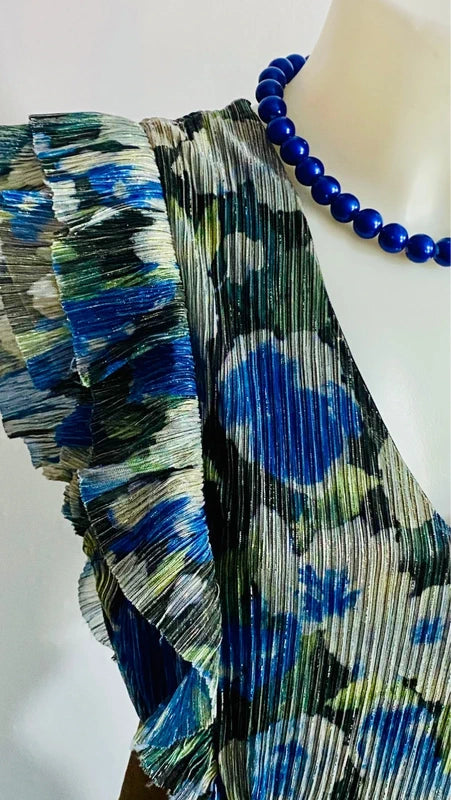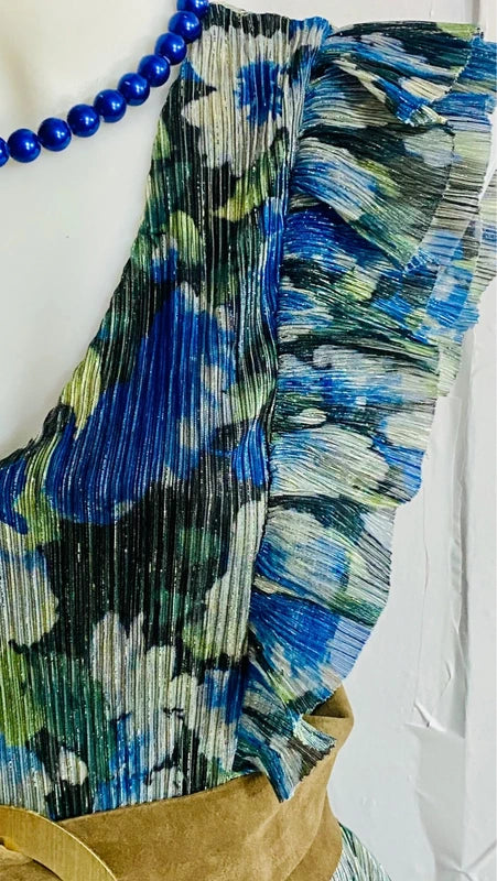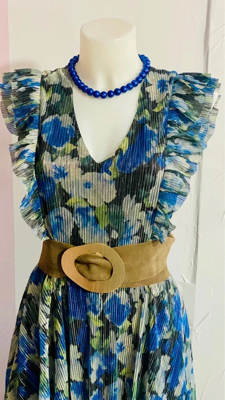 Elegance and femininity meet in this long ruffled dress with a vibrant floral print. The delicate V-neck and short ruffled sleeves add a touch of movement and lightness, while the multi-tiered pleated skirt creates a flowing, full effect. The shades of blue, green, and black on a light background enhance the floral print, making this piece perfect for a refined and irresistible vintage look. Wear it to stand out in style on any occasion.