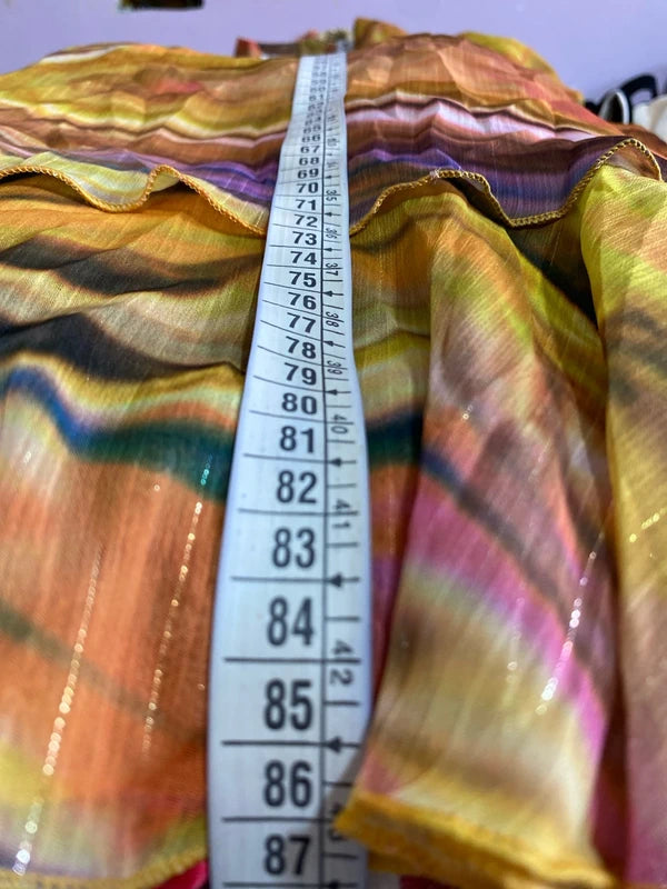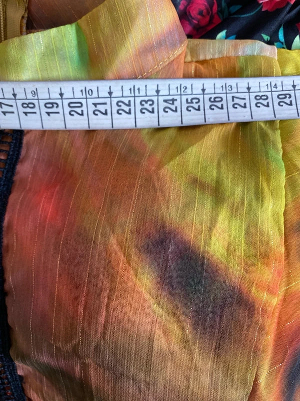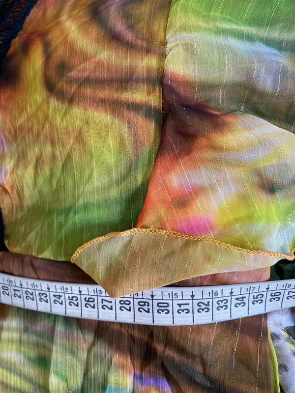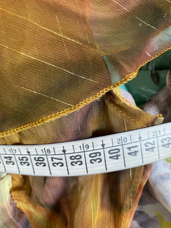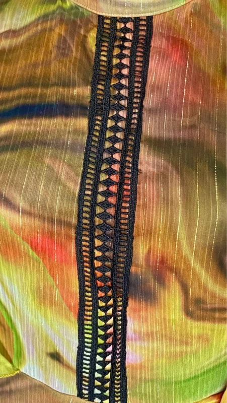 Discover this fabulous women's dress with a collar embellished with a sheer lace stripe, ideal for those seeking a touch of refined elegance. Crafted from lightweight voile with an abstract pattern and shiny metallic fibers, it offers a unique and sparkling effect. The two-tiered ruffled design and butterfly sleeves add movement and femininity, perfect for special occasions. Size S/M, new with tags, a sophisticated and distinctive piece for an unforgettable outfit.