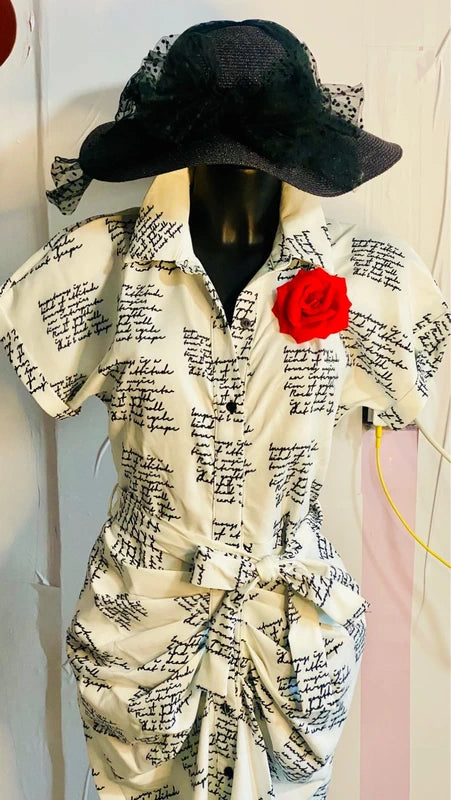 Elegante abito chemisier in bianco puro con drappeggio fluido che valorizza la silhouette. La stampa a grafia in nero aggiunge un tocco di sofisticatezza, mentre la spilla decorativa a forma di rosa rossa completa il look con un dettaglio gioiello. Lunghezza generosa di circa 114 cm, ideale per un'allure raffinata e versatile. Taglia S, adatto anche a chi indossa M/L grazie al taglio generoso. Un pezzo vintage che unisce praticità e charme bohemien, perfetto per occasioni speciali o per elevare lo stile quotidiano