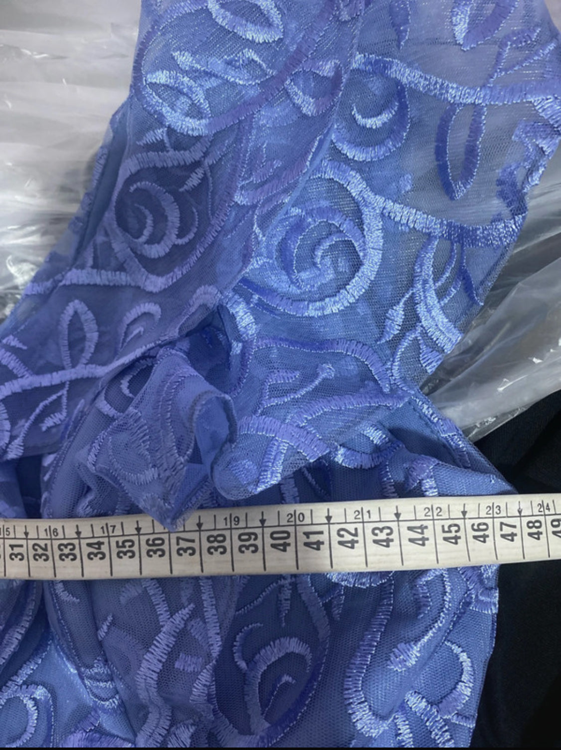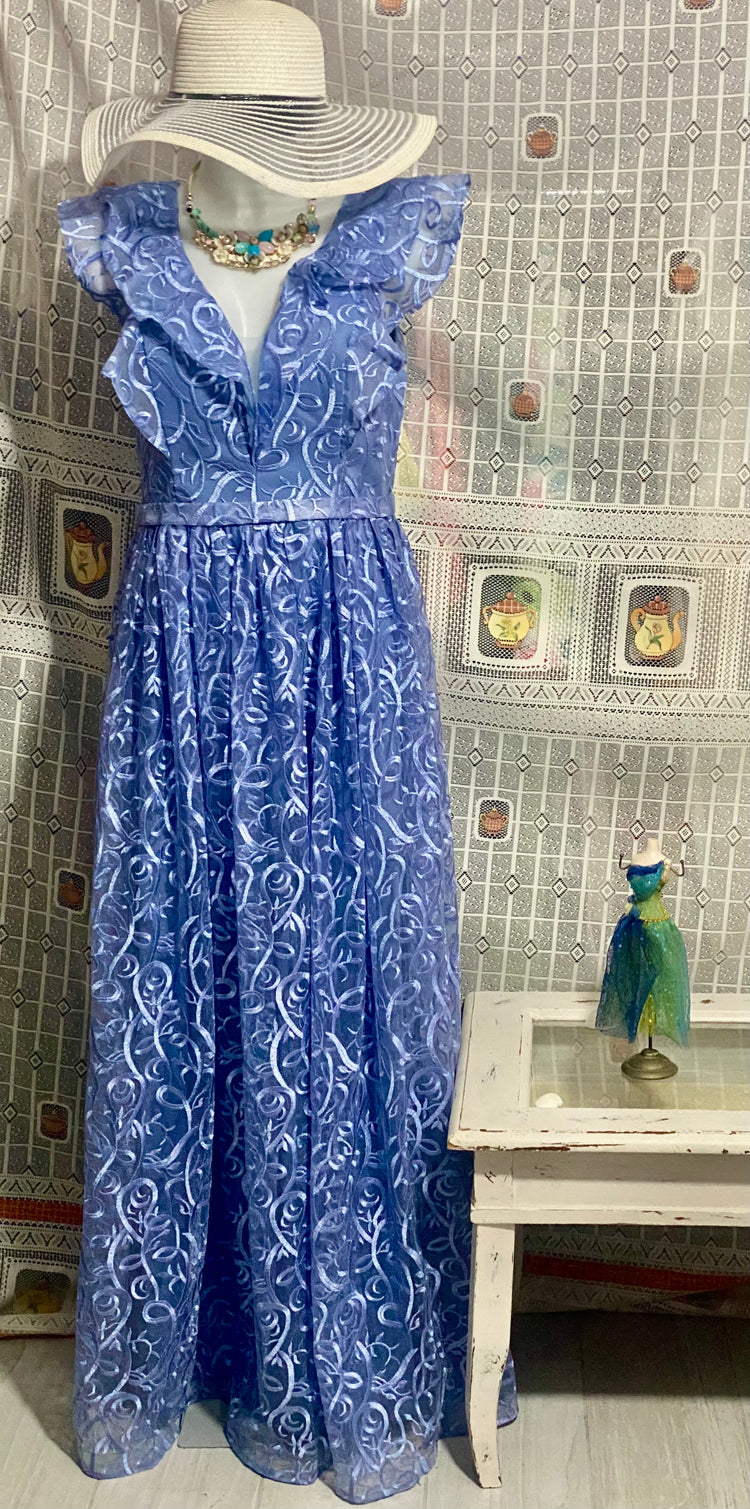Let yourself be enchanted by the elegance and sophistication of this long gala dress, featuring a lace and tulle effect. Its sheer mesh V-neckline and ruffled inserts on the shoulders lend a feminine and refined touch. The tone-on-tone floral or abstract pattern and the long, full skirt make it perfect for those around 160 cm tall. Complete the look with the fixed sewn belt and the scroll or arabesque motif, for an elegant, refined, and feminine outfit.