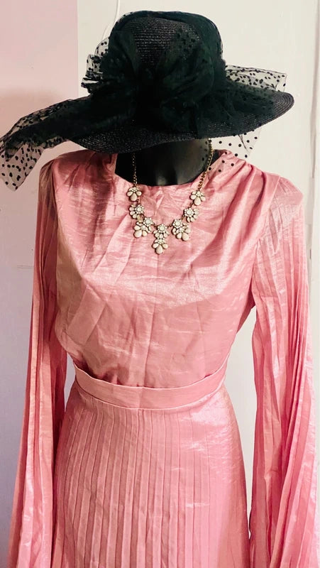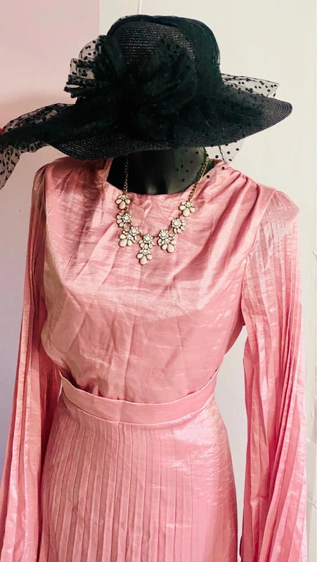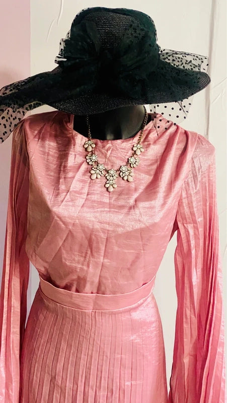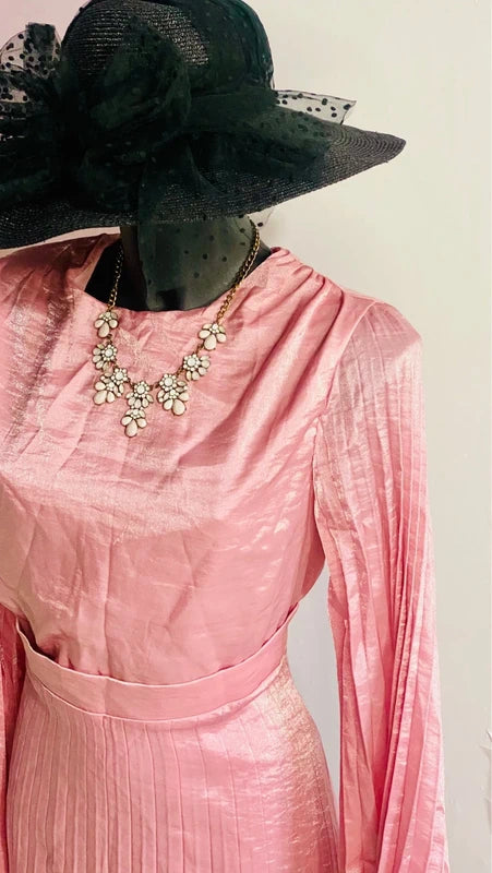 A long pleated dress with elegant batwing sleeves, it flatters the figure thanks to the fitted waistband that creates a slimming effect without the need for a belt. The shimmering fabric creates an enchanting effect, making it the perfect choice for special occasions like baby showers, weddings, or as a bridesmaid. A refined piece that combines style and comfort for an unforgettable look.