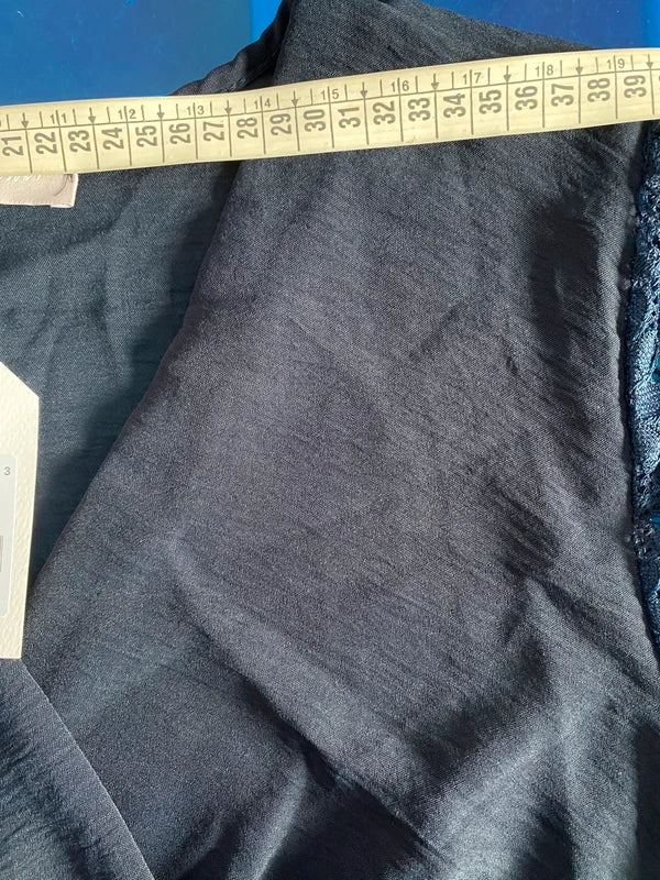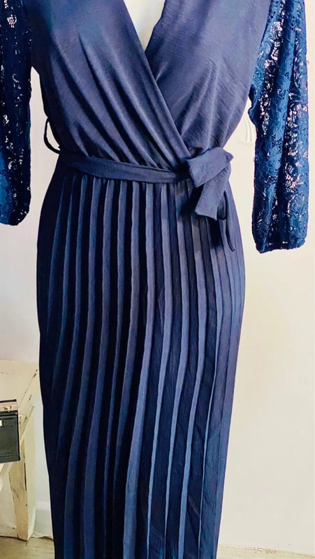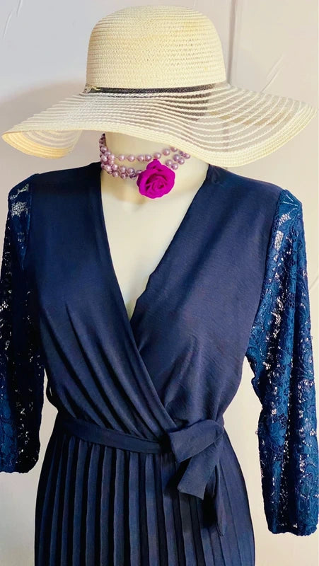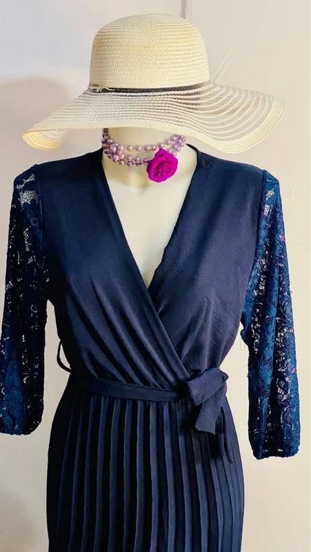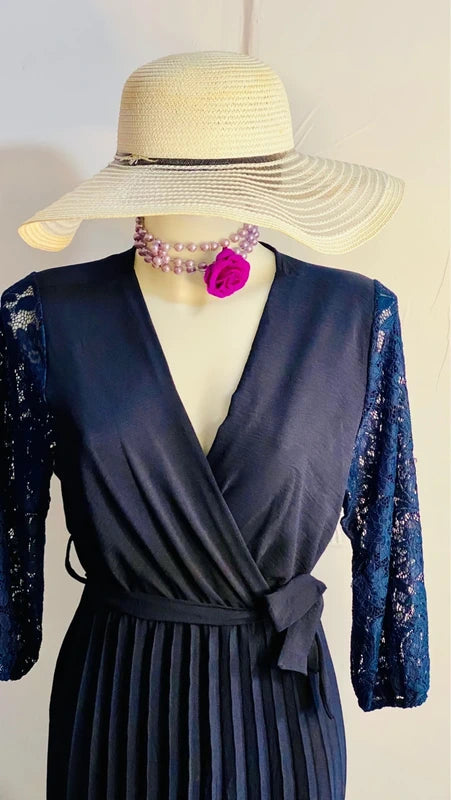 Elegante abito lungo in pizzo con plissettature raffinate e dettagli romantici che catturano lo sguardo. Lo scollo incrociato valorizza il décolleté, mentre le maniche a 3/4 in pizzo con elastico finale garantiscono comfort e movimento. La fusciacca in vita definisce la silhouette con grazia. Realizzato in blu marino, questo pezzo vintage è perfetto per occasioni speciali, cene eleganti o serate che richiedono un tocco di sofisticatezza. Un capo senza tempo che combina femminilità e classe in ogni dettaglio