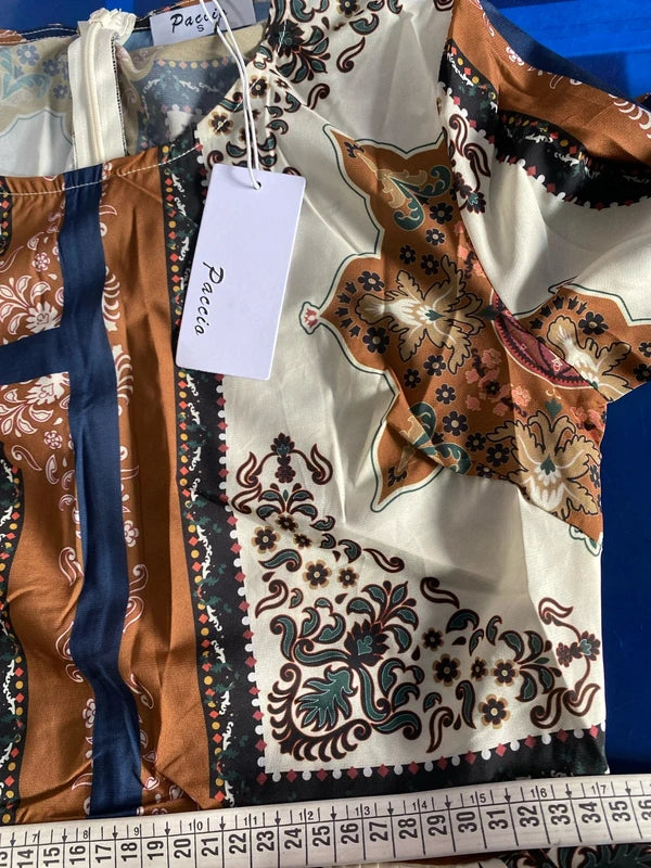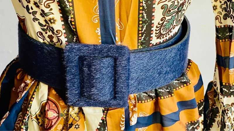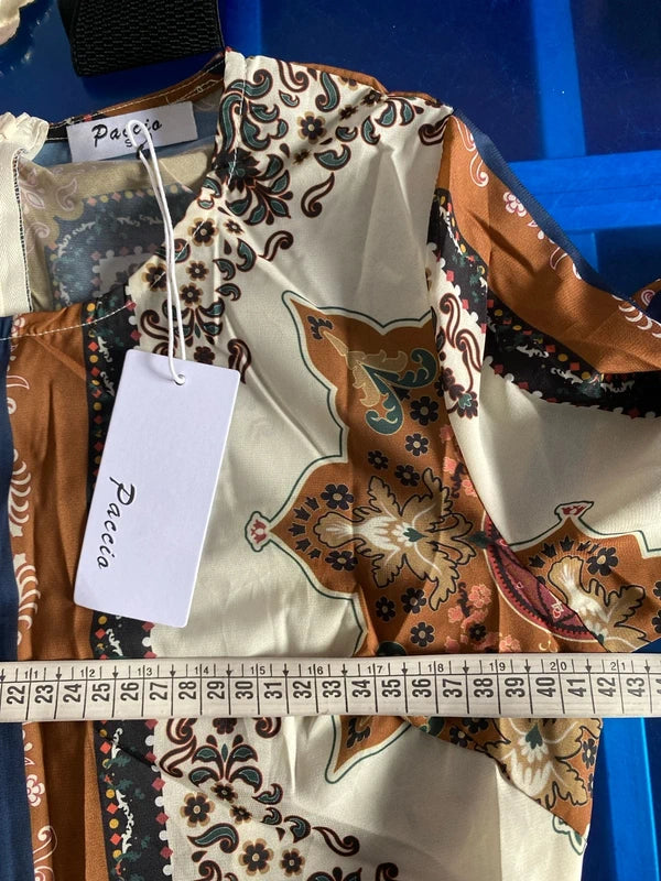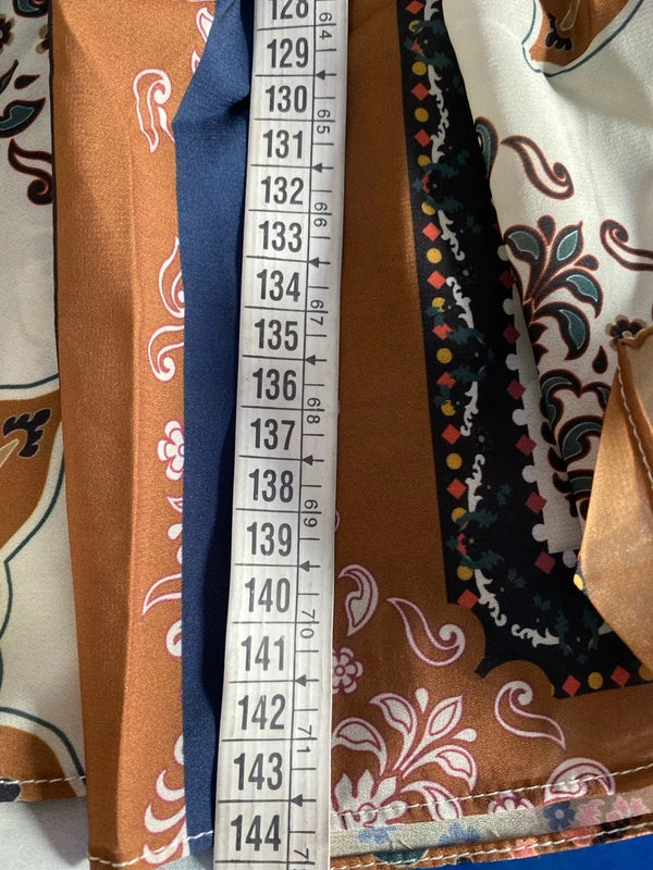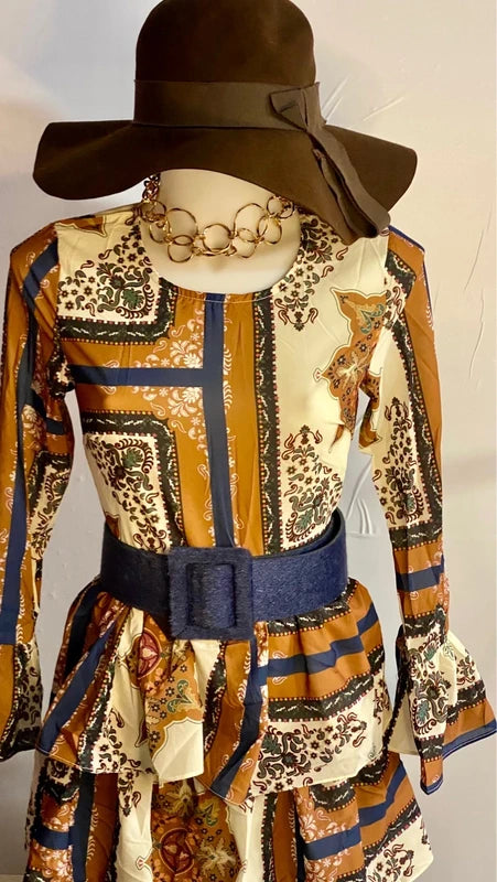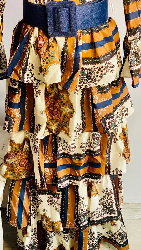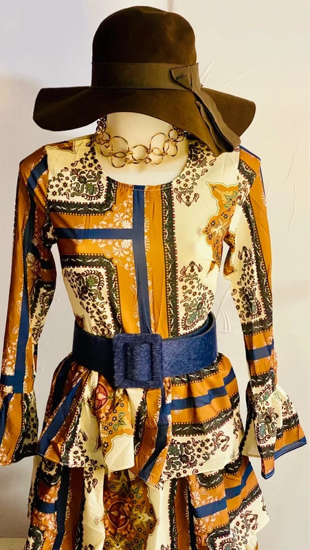 Questo straordinario abito lungo vintage cattura l'essenza dello stile bohemien con una stampa a blocchi che gioca tra tonalità marroni, crema e blu. Le maniche a campana donano movimento e eleganza, mentre la gonna a balze crea una silhouette romantica e affascinante. La cintura in vita coordinata in blu intenso sottolinea perfettamente la fantasia, creando un look coeso e sofisticato. Un pezzo senza tempo che trasforma ogni occasione in un momento di pura eleganza vintage. Completa il tuo stile con il cinturone abbinato disponibile nella sezione Accessori Donna
