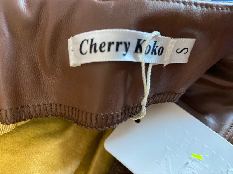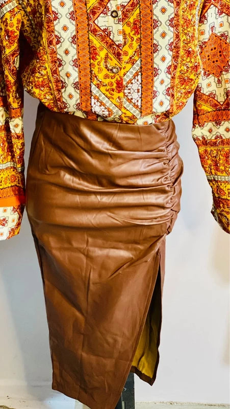 Camicia Monte Cervino in cotone con delicato motivo floreale, taglia S/M. Perfetta da indossare da sola o stratificata, include bottone di ricambio originale. Nuova con cartellino. Abbinala alla gonna drappeggiata Cherry Koko in ecopelle ecologica, taglia S, colore cioccolato. Vita alta slanciante, spacco laterale sensuale e cerniera di chiusura nascosta. Un coordinato romantico e versatile che cattura l'essenza dello stile vintage bohemien