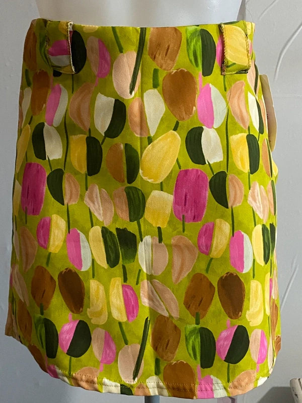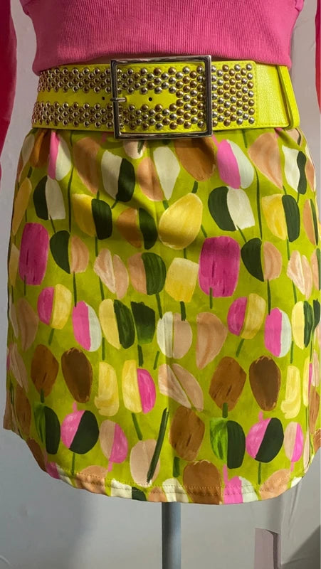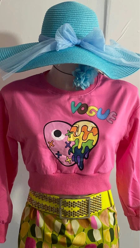A unique casual vintage ensemble, consisting of a stretchy crop top with a Vogue print and a high-waisted skirt featuring belt loops and a side zip closure. The skirt's abstract pattern adds a feminine and original touch, making this outfit perfect for those seeking style and personality in every detail.