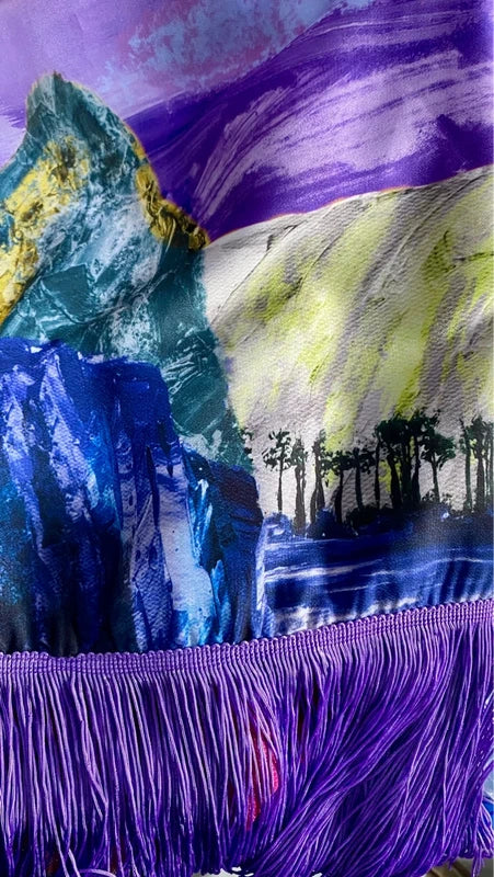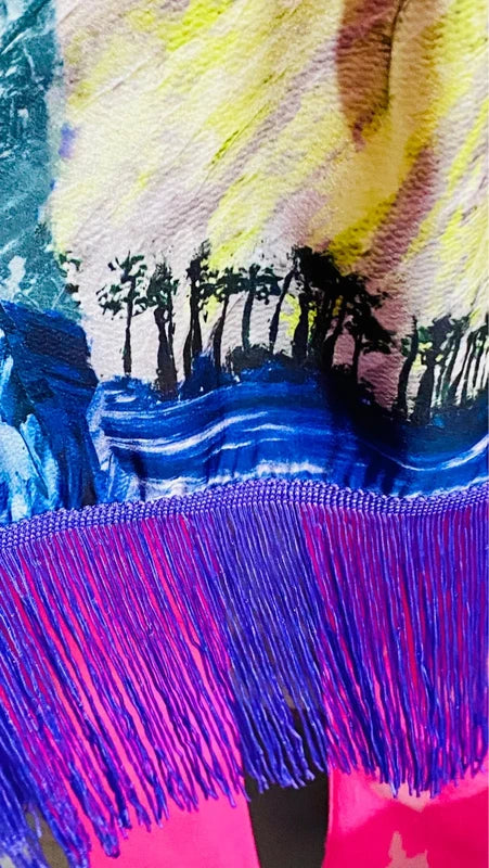 Discover the unique charm of this vintage women's ensemble, consisting of a viscose blouse-dress with an abstract landscape print and elegant fringe, perfect for a glamorous boho-chic look. Also ideal for curvy women, it can be worn as a dress or a top. Pair it with high-waisted faux leather leggings with elastic waistband, which add a modern and sensual touch to your outfit. A versatile and sophisticated combination to enhance every silhouette with style.