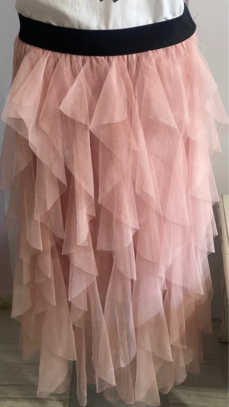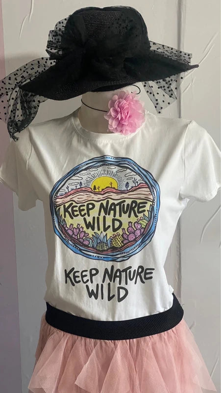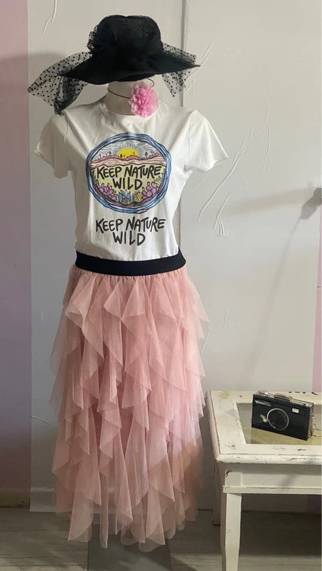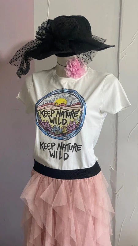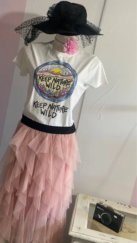 Women's ensemble, perfect for those who love a fresh and feminine style. The white short-sleeved T-shirt with the "KEEP NATURE WILD" graphic makes a bold statement, while the cascading tulle midi skirt creates a voluminous and airy effect, flattering the figure thanks to the elasticated high waist that ensures comfort and a perfect fit. A versatile and charming choice for any occasion.
