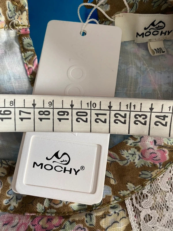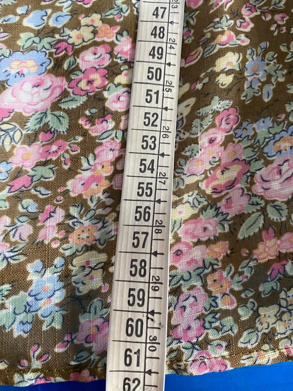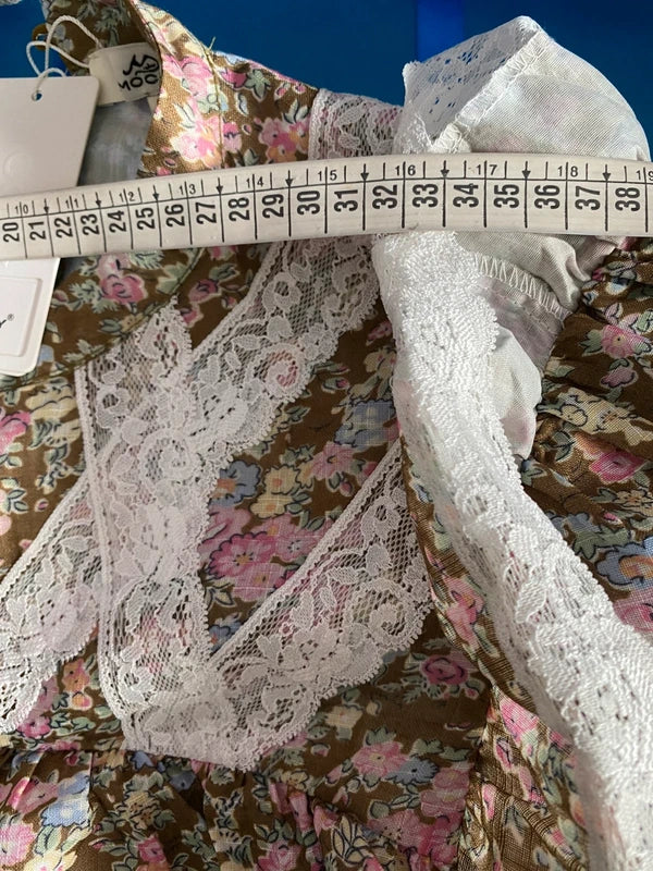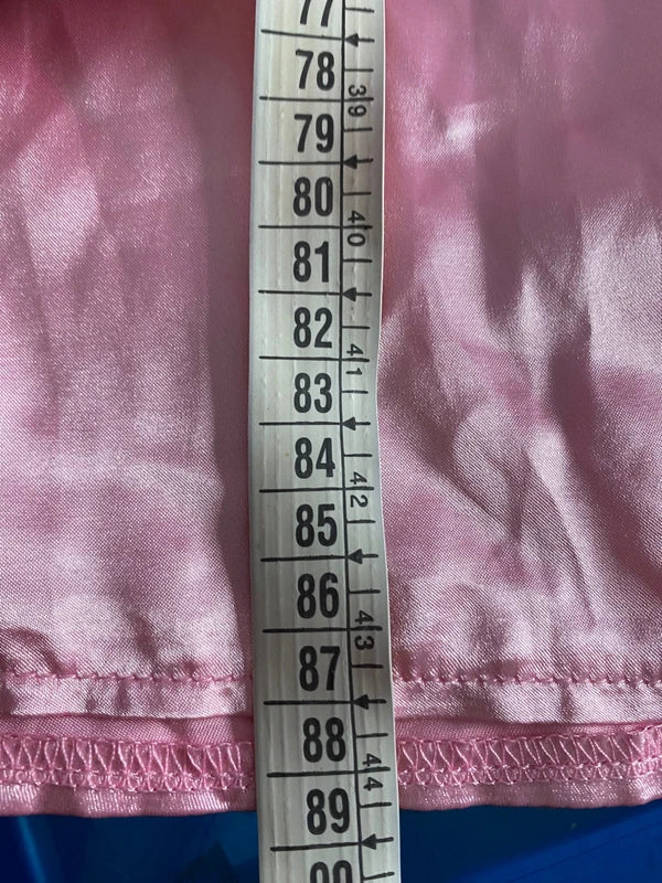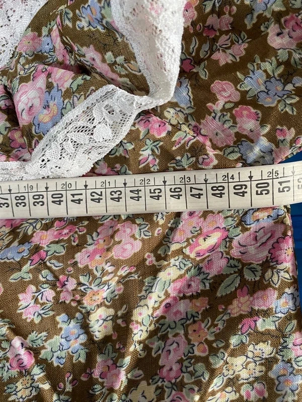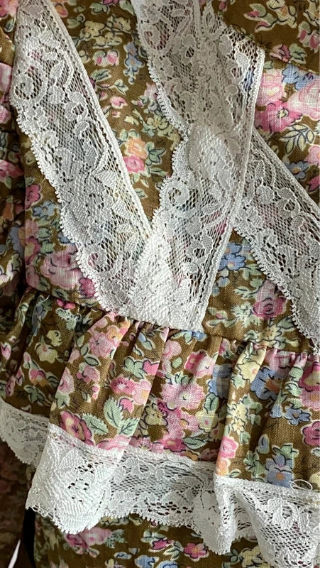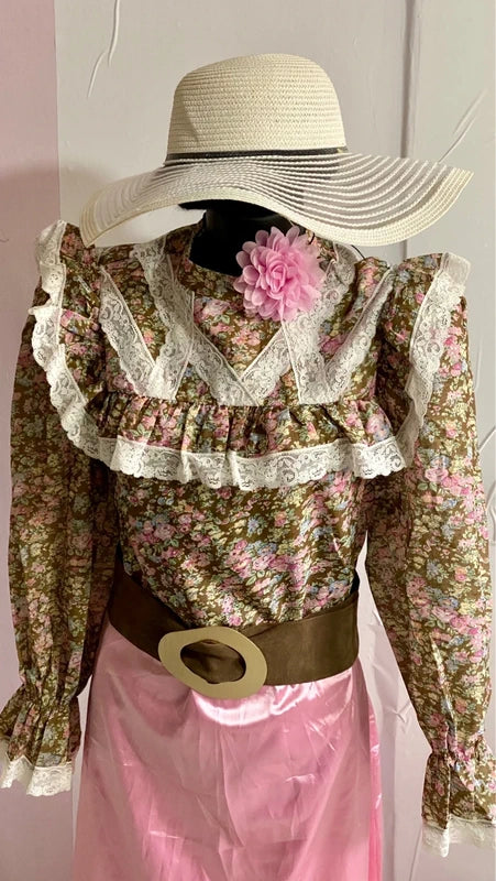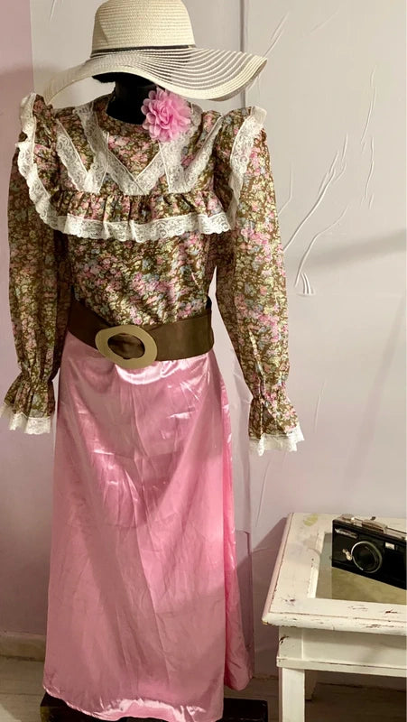 A vintage outfit in perfect country western style, ideal for those who love a romantic and original touch. It features a floral print on a dark background, enriched with wide white lace ruffles on the collar and chest, with long sleeves and gathered cuffs for a refined elegance. Made of shiny pink satin, it falls softly to the ankle, lending femininity and comfort to any occasion. A timeless outfit that captures the vintage spirit with charm and style.