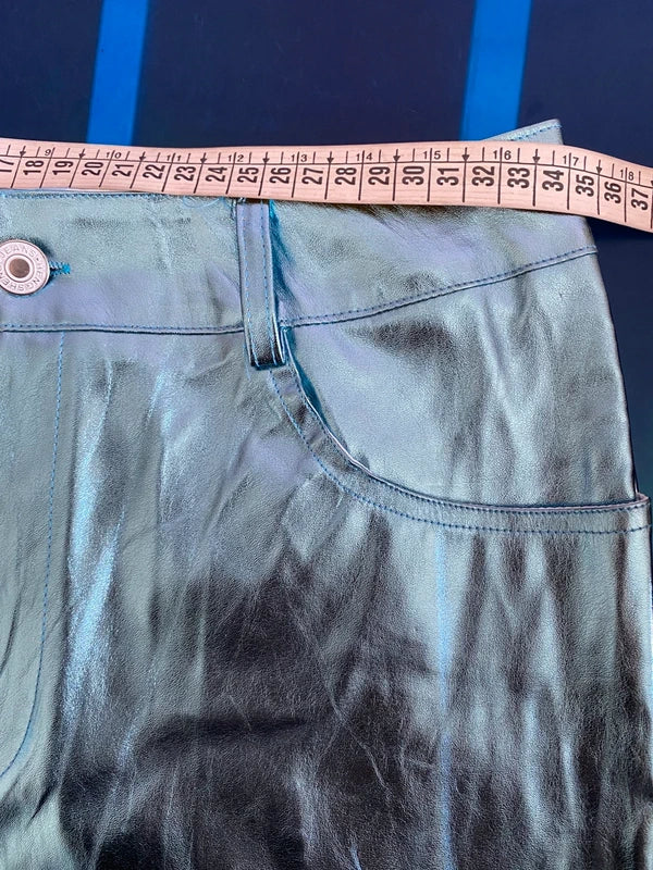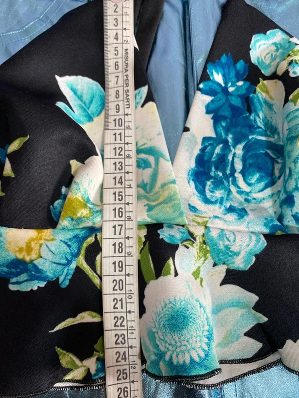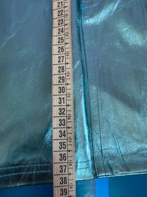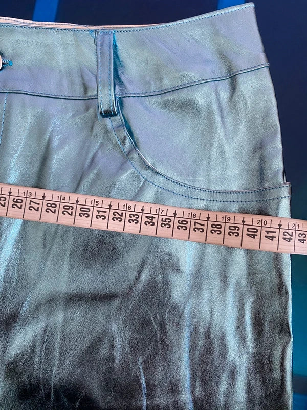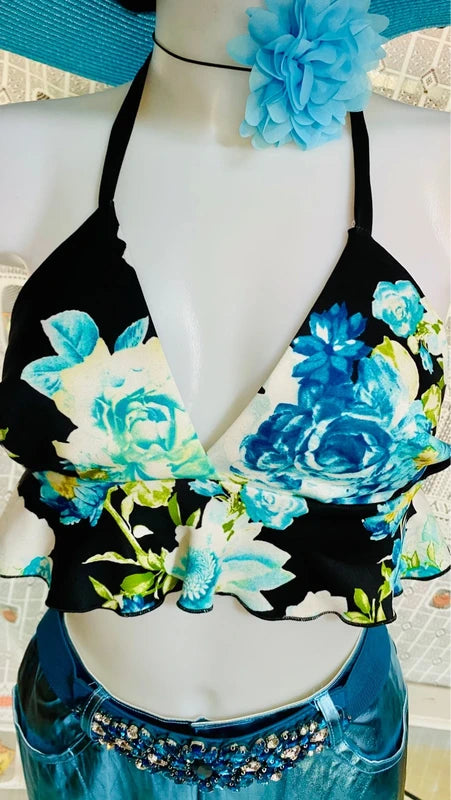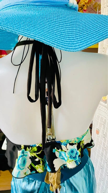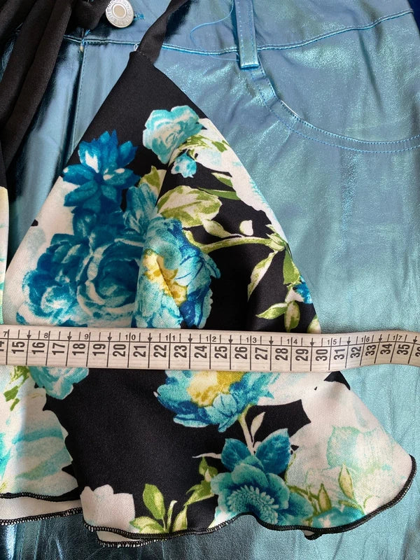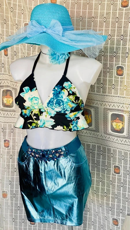 Discover the perfect outfit for a unique look: a high-waisted metallic light blue faux leather miniskirt, with no stretch for an elegant fit. The emerald green halterneck top, with stretchy fringes that hug the figure, leaves the back exposed, adding a sexy and sophisticated touch. Upon request, add the velvet belt with elastic stones for an even more precious detail. Elegance and style in every detail. The belt can be found in the Accessories section.