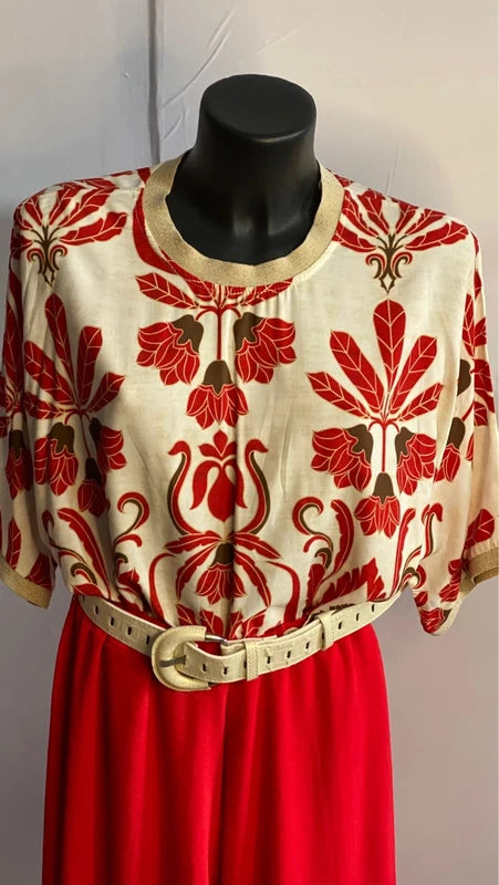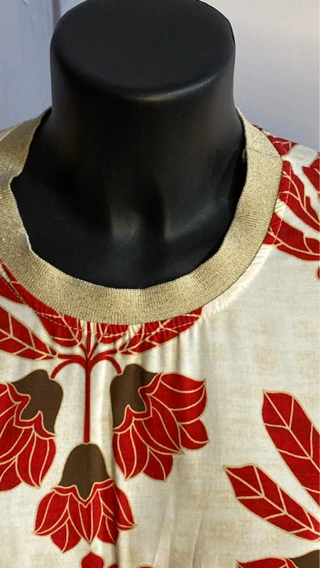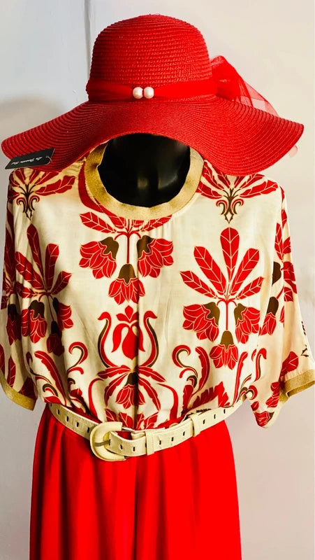 Scopri il fascino bohemien di questo completo over size che celebra la femminilità in tutte le sue forme. La casacca in viscosa 100% vanta un delicato motivo floreale e dettagli dorati al collo e alle maniche, mentre il pantalone a gamba ampia crea un effetto gonna fluido e avvolgente. Perfetto per chi ama uno stile romantico e confortevole, questo pezzo versatile si adatta da una XS fino alla 54, garantendo a ogni donna di sentirsi bella e sicura di sé