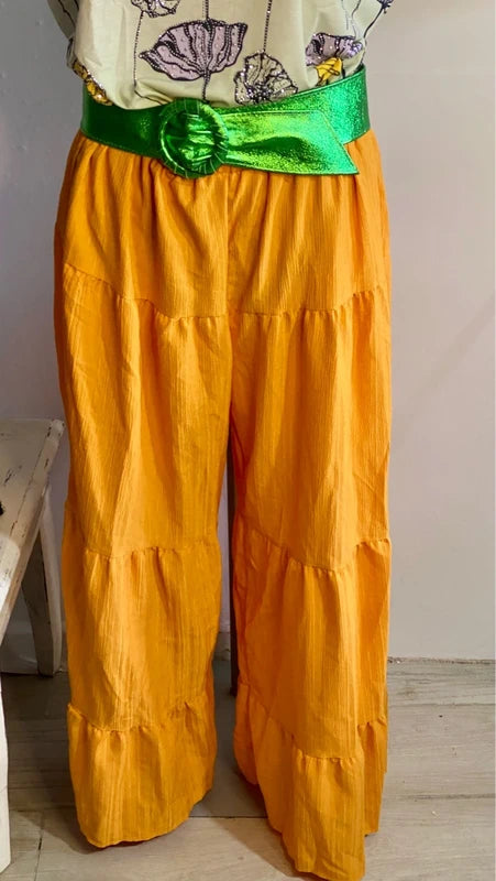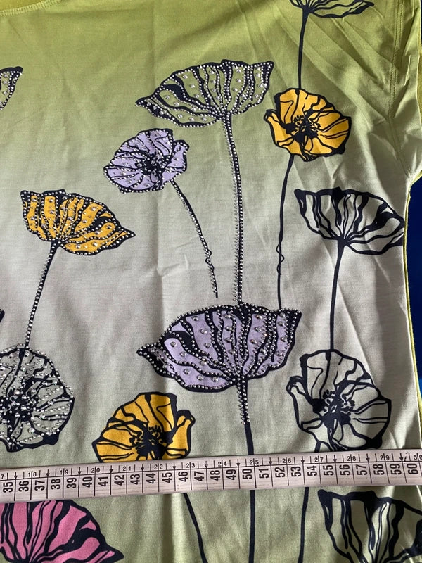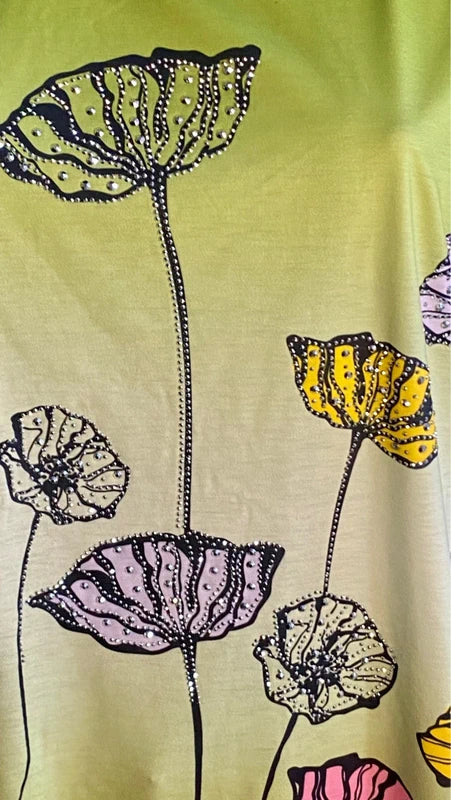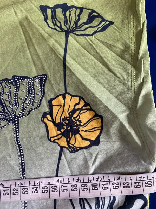 Scopri il fascino bohemien di questo straordinario set coordinato. La T-shirt curvy Over abbina sfumature di verde oliva in un delicato degradé, impreziosita da motivi floreali con strass che catturano la luce. Realizzata in cotone e Lycra, offre comfort e elasticità perfetti per le taglie forti (54/56). Il pantalone a balze con elastico in vita si adatta da una 46 fino a 54/56 cm, garantendo una vestibilità impeccabile. Un'armonia di stile vintage e praticità moderna che esalta le curve con eleganza senza compromessi