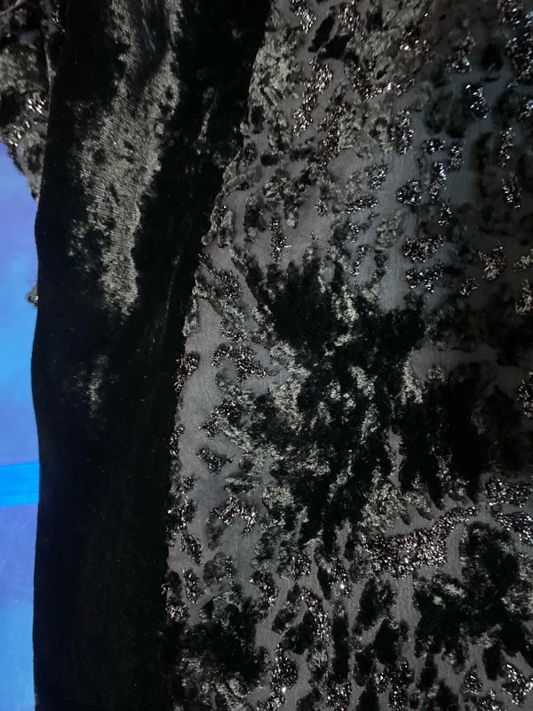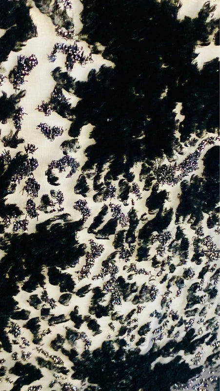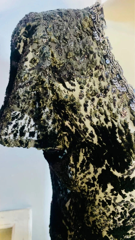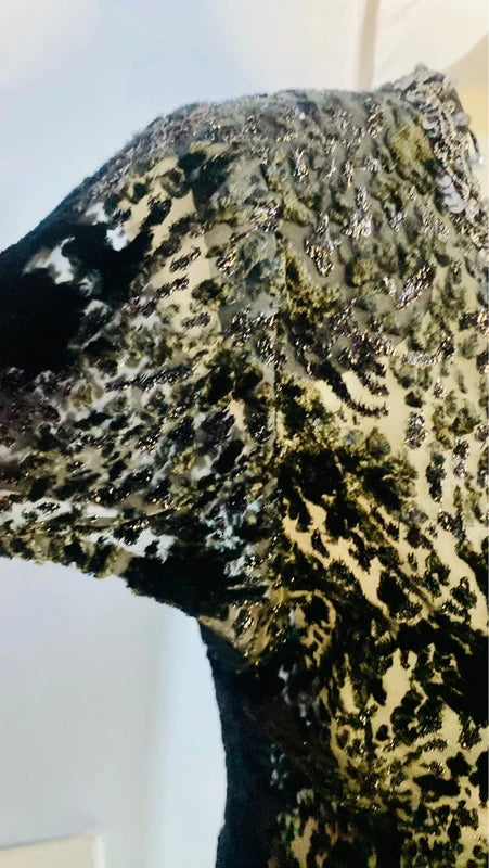 Abito vintage anni '80 in perfette condizioni, un pezzo raro che cattura l'essenza dello stile retrò più affascinante. Il tessuto presenta sofisticati schizzi di velluto astratti che evocano un effetto leopardato, mentre la parte superiore trasparente aggiunge un tocco di sensualità e movimento. Le spalline modellanti garantiscono una silhouette impeccabile, valorizzando la figura con eleganza. Dettagli ricercati completano il design: collo decorato con paillettes incrociate anche sul retro e spacchi laterali che conferiscono dinamicità al capo. Chiusura laterale con cerniera per una vestibilità perfetta. Taglia 48/50. Un investimento di stile per chi sa riconoscere l'unicità del vintage autentico
