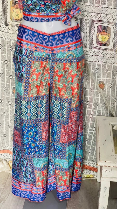 This women's silk and viscose ensemble, with a vintage Boho Chic style, is a true Made in India gem. One size fits all, fitting up to a size 46/48, it offers a comfortable fit thanks to the top with adjustable straps and a versatile sash that can be tied as desired. The elasticated back band ensures extra support, while the wide-leg trousers, with a double elasticated back band, flatter the silhouette, adding sleekness and elegance to every move. Perfect for those seeking style and practicality in a single garment.