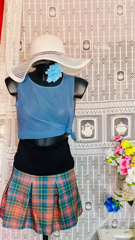 Gonna plissettata con cintura a fascia alta e motivo a quadri, perfetta per chi ama uno stile sofisticato e versatile. Abbinata a un elegante top in seta trasparente con giromanica, arricchito da un delicato nodo che aggiunge movimento e femminilità al look. Entrambi i capi sono in taglia M e rappresentano pezzi unici, ideali per chi ricerca dettagli curati e tessuti di qualità. Un ensemble che cattura l'essenza del vintage con un tocco contemporaneo e romantico