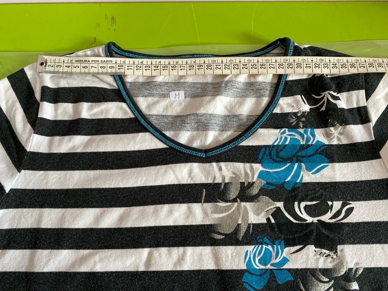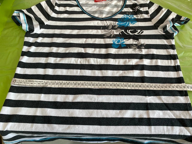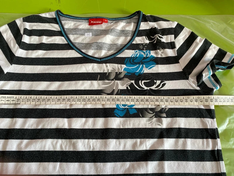 Scopri il fascino Retrò con questo completo vintage italiano che unisce eleganza e comfort. La gonna longuette in denim jeans, arricchita da un delicato pizzo sul finale, presenta una pratica cerniera anteriore e tasche posteriori con spacco. Realizzata in cotone e lycra, garantisce una vestibilità morbida e confortevole. L'abbinato top a mezza manica sfoggia uno scollo leggermente a V con motivi floreali su fantasia a righe orizzontali, perfetto per chi ama uno stile vintage autentico. Taglia 48 (il top veste grande, consigliato per chi porta una M). Made in Italy, un pezzo unico che racchiude lo stile senza tempo del vintage