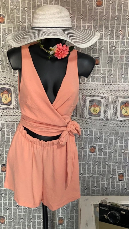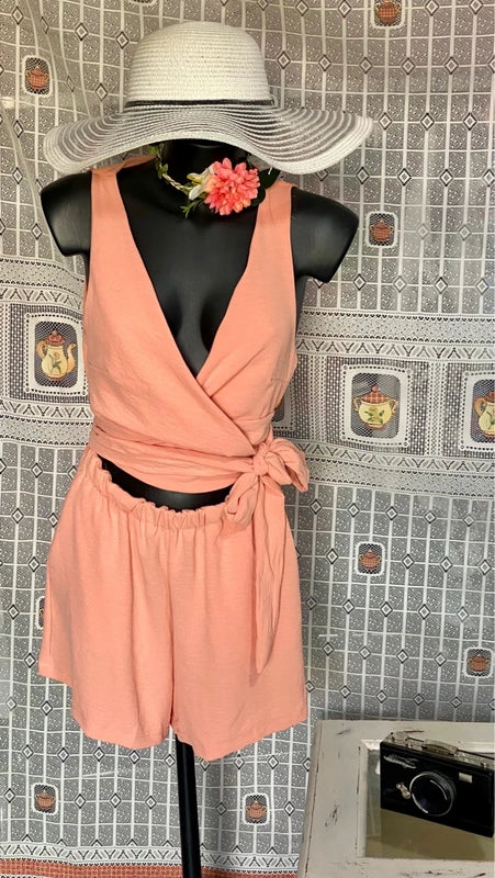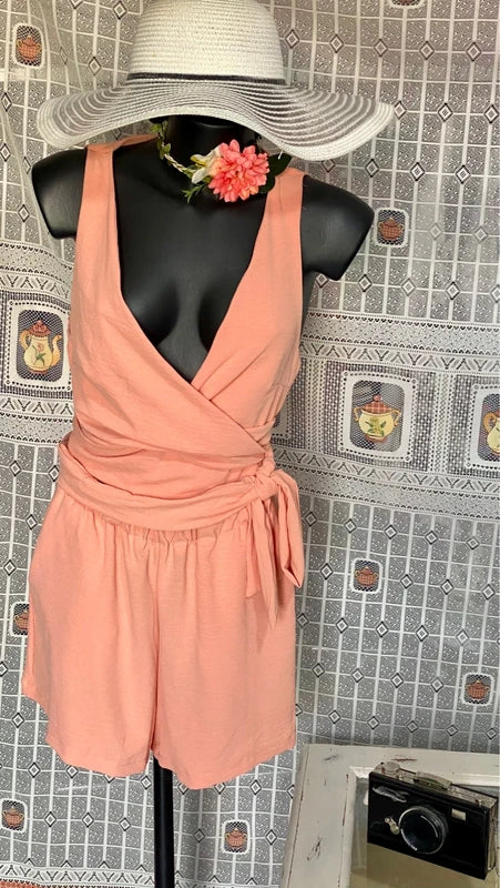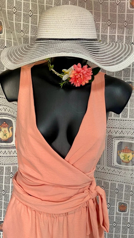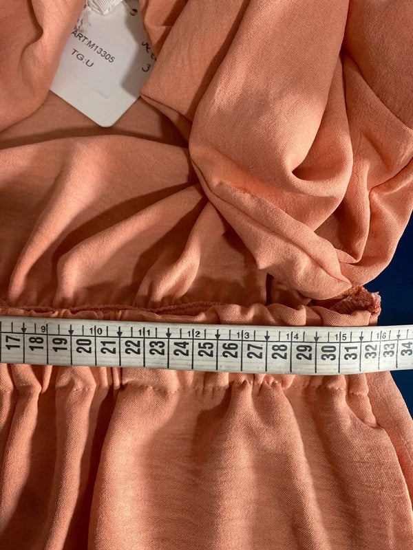 Sofia viscose jumpsuit in apricot, elegant and versatile thanks to the adjustable wrap that flatters every figure. The loose fit and elastic waistband offer a comfortable fit. It includes a long sash that can also be used as a belt to accentuate loose-fitting shorts.