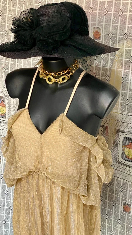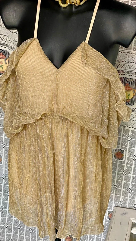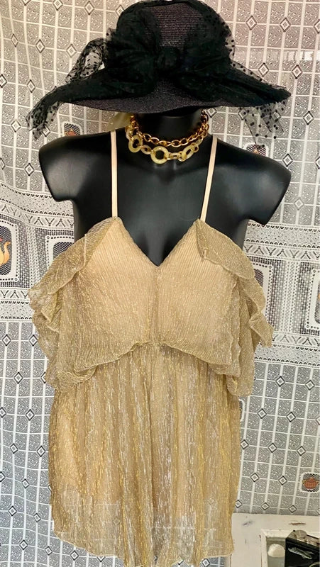 GOLD glitter playsuit, enriched with luminous metallic fibers that sparkle with your every move. The V-neck with adjustable straps ensures a perfect fit, while the gold and bronze tones add sophisticated elegance. Crafted from stretchy and comfortable fabric, this playsuit is ideal for those who want to combine comfort and style in a refined and distinctive outfit, perfect for special evenings and classy moments.