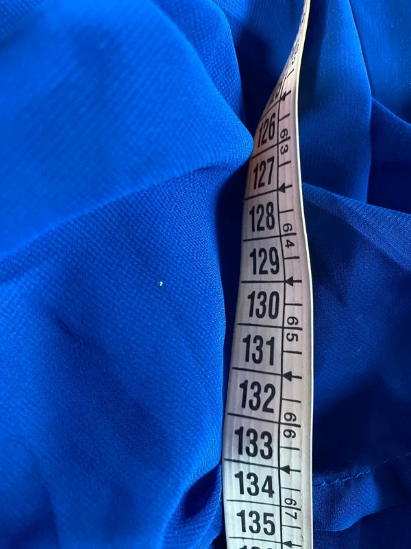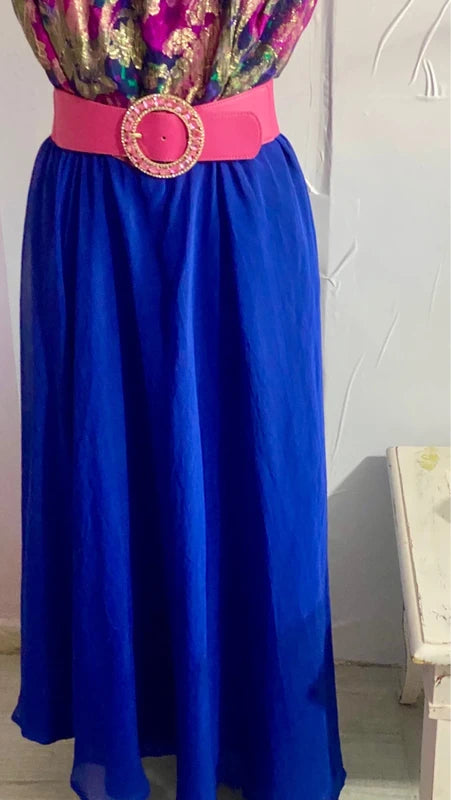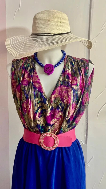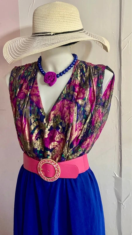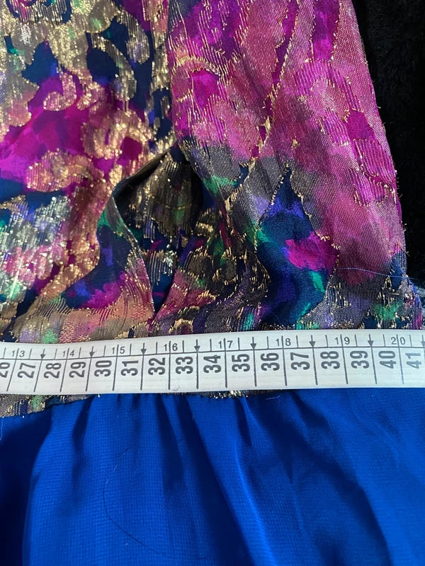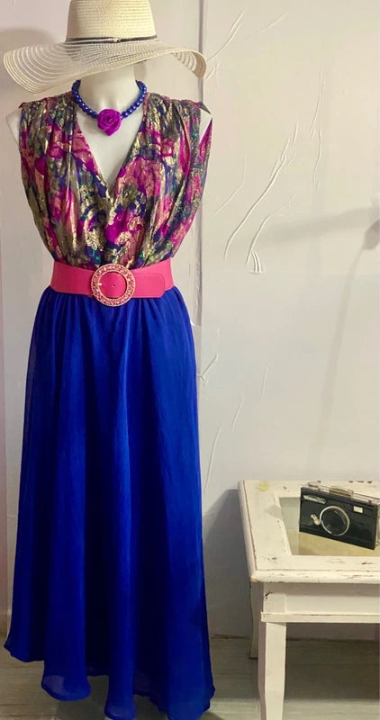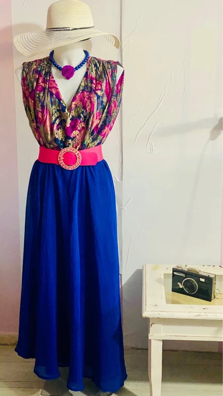 This long dress combines elegance and originality with a sleeveless top embellished with a bright floral pattern in shades of fuchsia and gold against a blue background. The long, flowing skirt in electric blue adds movement and sophistication. It features a hidden zip in the sleeve for a unique tailored detail. Ideal for special events, weddings, and gala evenings for a sophisticated vintage touch.