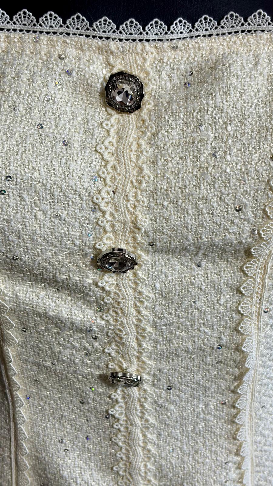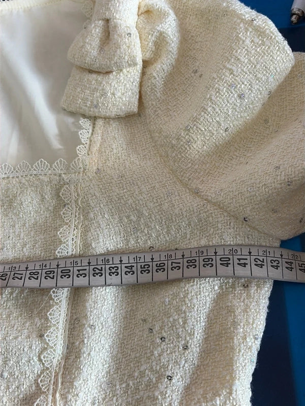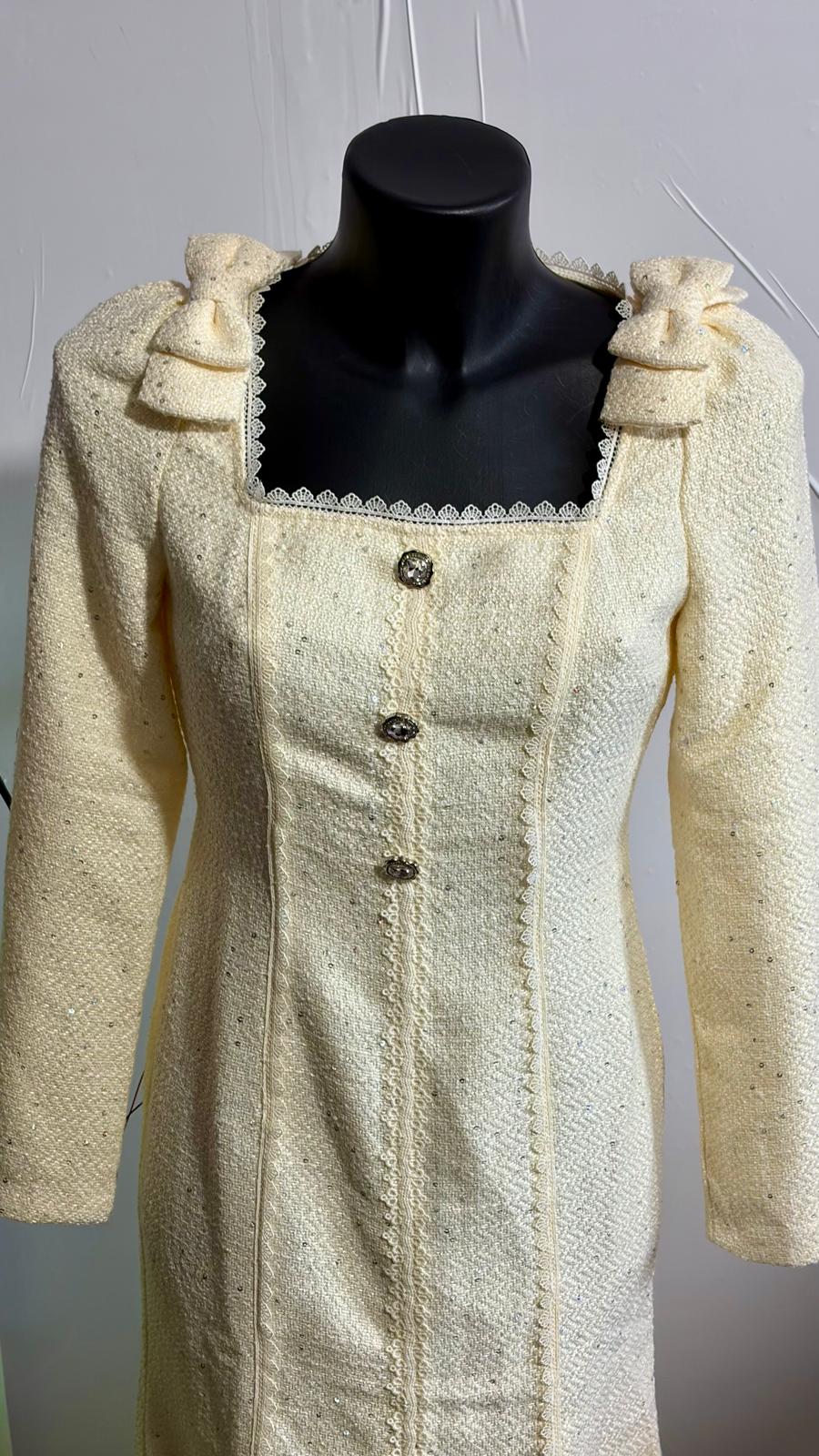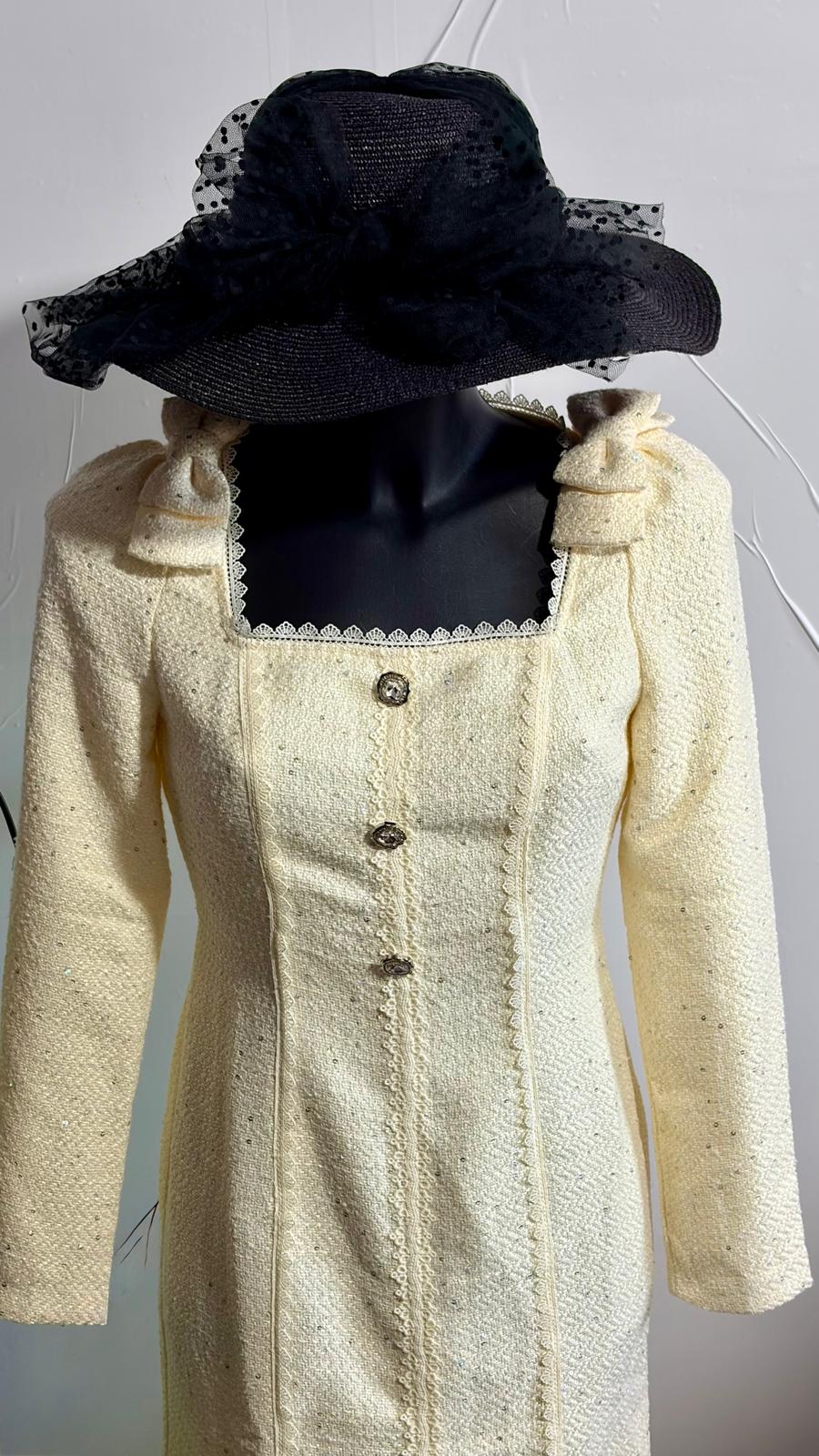 Abito midi vintage Zeilah in viscosa bouclé color crema, un pezzo autentico degli anni '60 che incarna eleganza senza tempo. Lo scollo quadrato delicato è impreziosito da bottoni decorativi in pietra e strass, mentre le finiture in pizzo bianco aggiungono raffinatezza. La silhouette a sirena segue le curve con grazia, completata da una lunga cerniera posteriore e fiocchi tono su tono fissati alle spalle. Perfetto per chi ricerca un capo sofisticato e caratteristico. Taglia XS, adatto anche a S