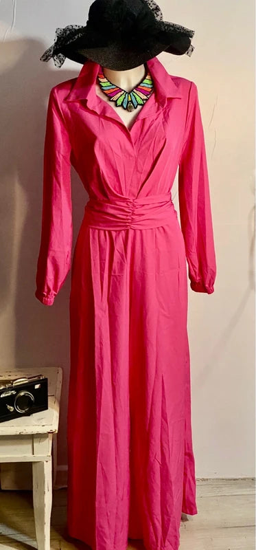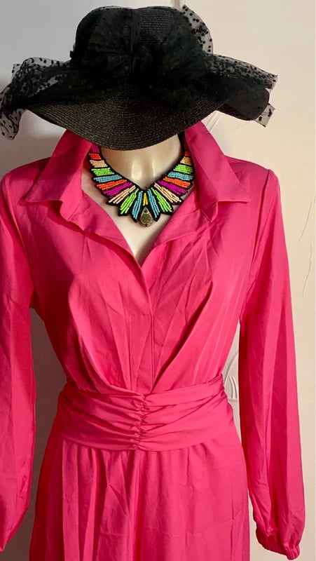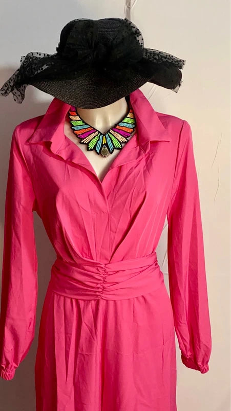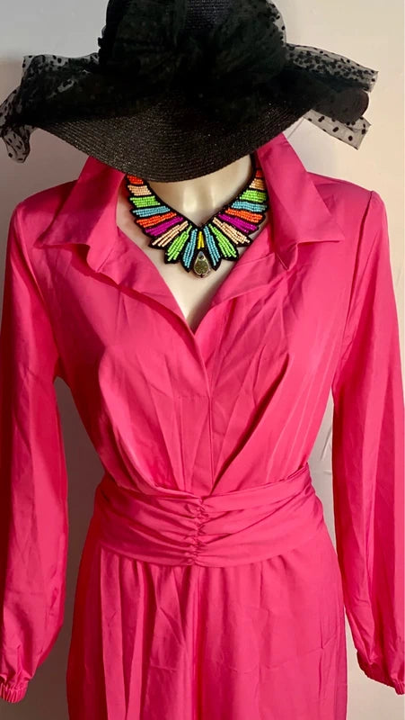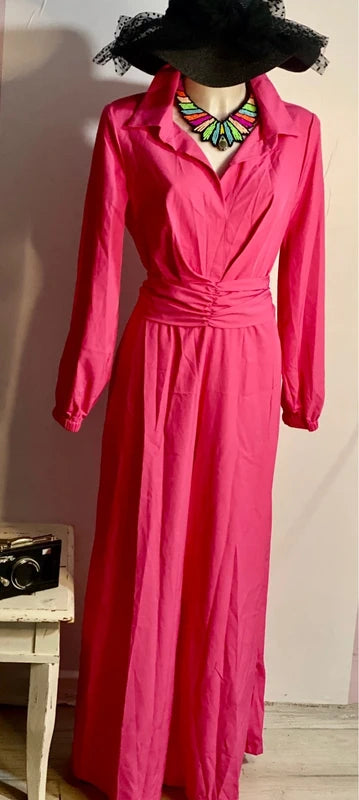 Elegante tuta vintage con gamba ampia che crea un effetto gonnellone sofisticato. Caratterizzata da una cintura a fusciacca tono su tono ideale per creare un fiocco sul retro e personalizzare il look. La chiusura con cerniera posteriore offre praticità, mentre il collo versatile può essere indossato alto o piegato a camicia per adattarsi a diversi stili. Con elastico in vita fino a 46 cm e lunghezza di circa 150 cm, questa tuta si adatta perfettamente a chi desidera un capo statement che unisce comfort e raffinatezza bohemien