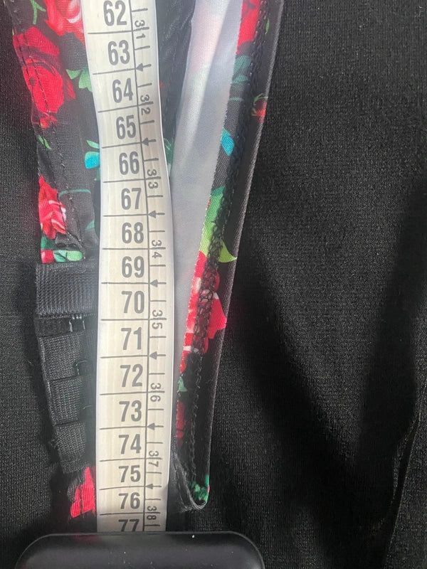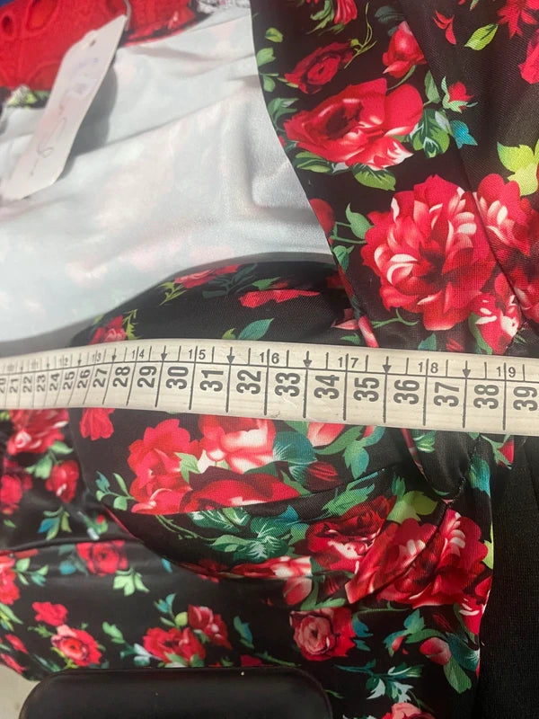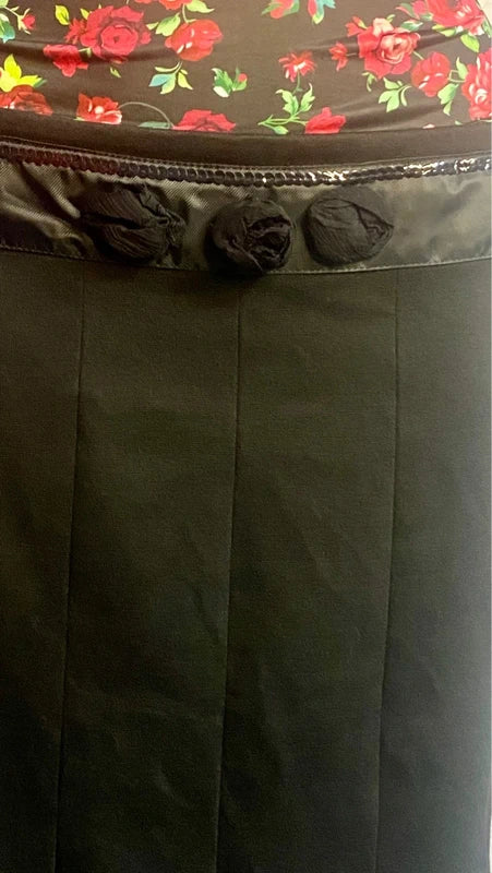 Gonna longuette vintage di straordinaria eleganza con cintura fissa decorata da nastrino e rose di stoffa con paillettes sfrangiate. Realizzata in Italia, presenta un raffinato finale in pizzo che esalta la silhouette. Abbinato a un top body rosso con fantasia floreale e coppe modellanti, ispirato allo stile Dolce & Gabbana. L'elastico garantisce una vestibilità comoda a partire dalla taglia L. Entrambi i capi sono in ottime condizioni, perfetti per chi ricerca pezzi vintage autentici e sofisticati con quel tocco di lusso senza tempo