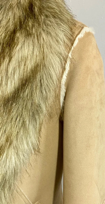 Cappotto in montone e shearling con collo in pelliccia sintetica fissa, perfetto per chi ama uno stile bohemien sofisticato e senza compromessi. Indossato una sola volta, mantiene tutta la sua morbidezza e calore. Le tasche funzionali e la cerniera pratica lo rendono versatile per ogni occasione, mentre la vestibilità generosa consente di indossarlo anche in modo over per un look ancora più affascinante. Pezzo unico che unisce comfort e eleganza vintage. In omaggio, bellissimo cappello nuovo in feltro (misure 57/58 cm)