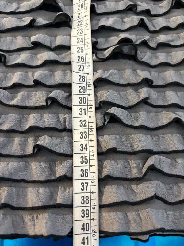 Completo vintage bohemien composto da tre pezzi coordinati. La blusa nera presenta maniche lunghe ampie con orli elasticizzati e scollo a V profondo, realizzata in doppio tessuto. La gonna a balze grigia con dettagli neri è elasticizzata e si adatta da XS a L/XL. Completano l'outfit un cappello cloche in pizzo grigio e bianco con fiore centrale e decorazioni ricamate, e una spilla floreale in tulle grigio con perla rimovibile. Tutti i pezzi in ottime condizioni. Vestibilità flessibile da S a M/L per la blusa