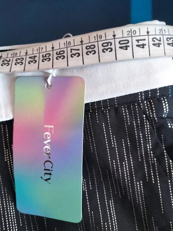 Trasforma la tua serata con questo outfit sofisticato e affascinante. Il top body bustier nero con spalline sottili e drappeggi arricciati valorizza la silhouette con eleganza, mentre i pantaloni a gamba larga con righe verticali metallizzate creano un effetto luminoso e dinamico. La fascia a contrasto in vita definisce perfettamente la silhouette. Perfetto per eventi speciali, cene eleganti o serate che richiedono stile e personalità. Disponibile in taglie S/M per il top (elastico fino a L) e M per i pantaloni. Un'armonia di dettagli che cattura lo sguardo e ti fa sentire straordinaria
